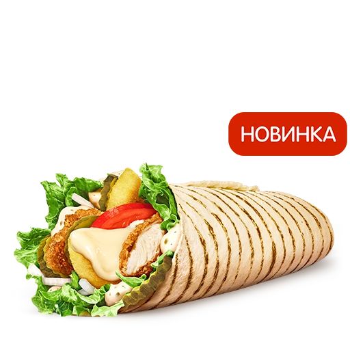 Устроим каникулы во Франции? В румяную тортилью Гриль завернули куриные стрипсы под пикантным соусом Тартар и тающий в хрустящем кармашке сыр Гауда, а ещё ломтики томата, салат Айсберг, лук и маринованные огурчики.