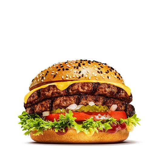 Прокачанный Гранд Чиз Фреш с двойным бифштексом по-домашнему, приготовленным на огне — это суперсочно! Внутри свежие помидоры, салат Айсберг, лук, маринованные огурчики, ломтики сыра Чеддер, кетчуп и горчица — на румяной булочке с кунжутом!