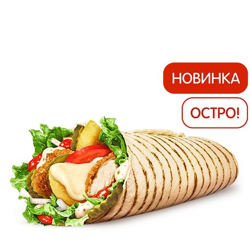 Острая тема! Ощути парижский вайб: в румяную тортилью Гриль завернули куриные стрипсы и сыр Гауда, тающий в хрустящем кармашке, заправили пикантным соусом Тартар и жгучим томатным соусом, а ещё добавили ломтики томата, салат Айсберг, лук и маринованные огурчики.