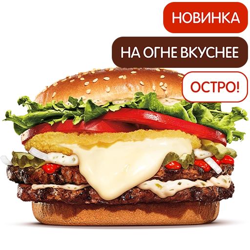 Бонжор, мясье! Теперь ещё больше соуса! На булочку с кунжутом уложили два бифштекса из фирменной говядины на огне под щедрой порцией пикантного соуса Тартар и острым томатным соусом и сыр Гауда, тающий в хрустящем кармашке. А ещё добавили сочных овощей: салат Айсберг, ломтики томата, рубленый лучок и маринованные огурчики.