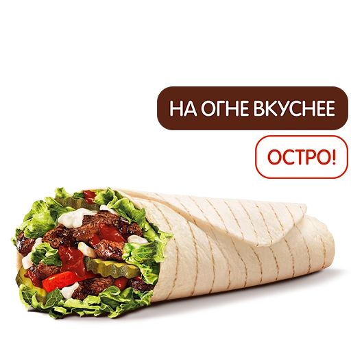 Это острая версия любимого Воппер Ролла — со жгучим соусом вместо кетчупа! Ломтик томата, салат Айсберг, лук, маринованные огурчики и 100%-я говядина на огне под острым томатным соусом! Как острый Воппер, только ролл!
