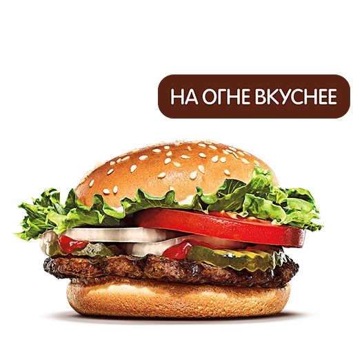 Приготовленный на огне бифштекс из 100% говядины, сочный помидор, свежий нарезанный салат, густой майонез, хрустящие огурчики и свежий лук на мягкой булочке, посыпанной кунжутом.