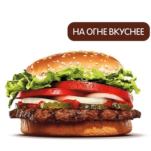 булочка для гамбургера с кунжутом(89 гр), котлета из говядины WHOPPER, майонез для салата, салат Айсберг, томаты, огурцы маринованные, лук репчатый, кетчуп томатный